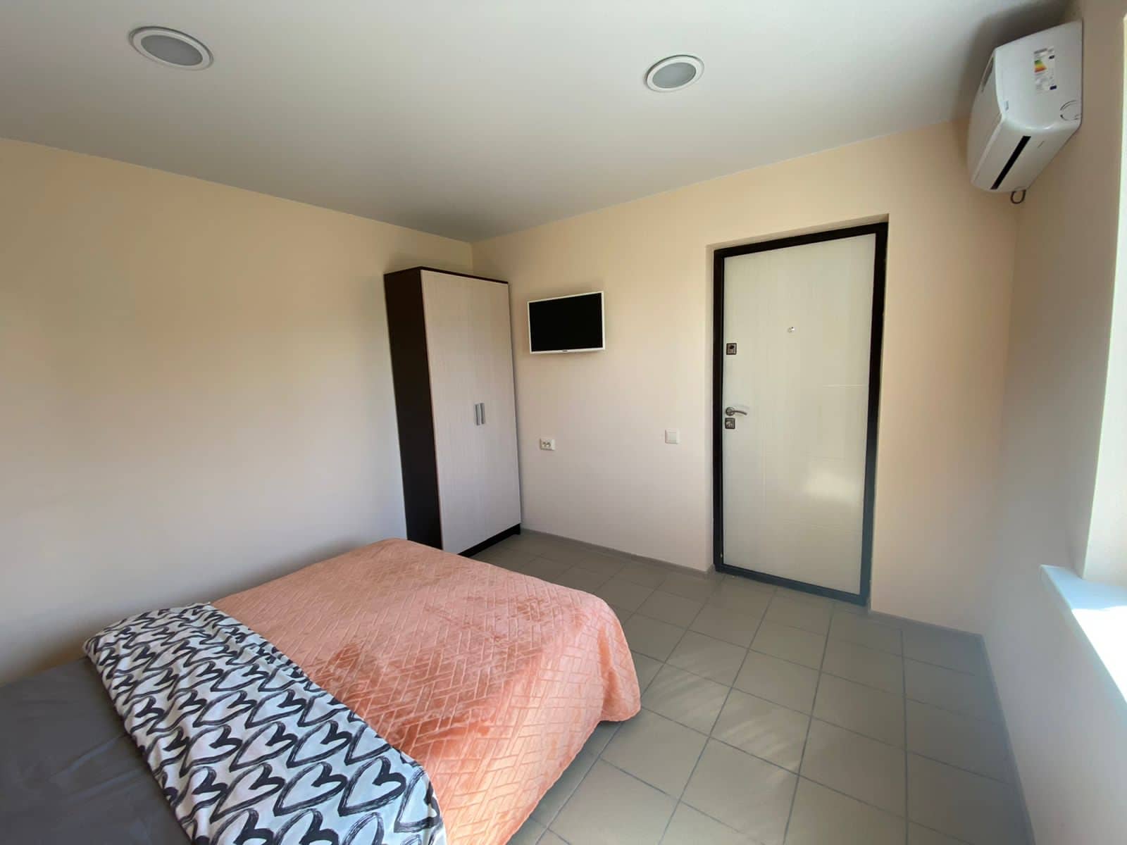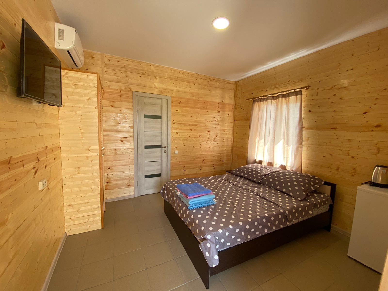 Номера оборудованы всем необходимым для проживания: двуспальная кровать, шкаф и тумбочка для белья, телевизор с Wi-Fi, холодильник, кондиционер, электрочайник.
